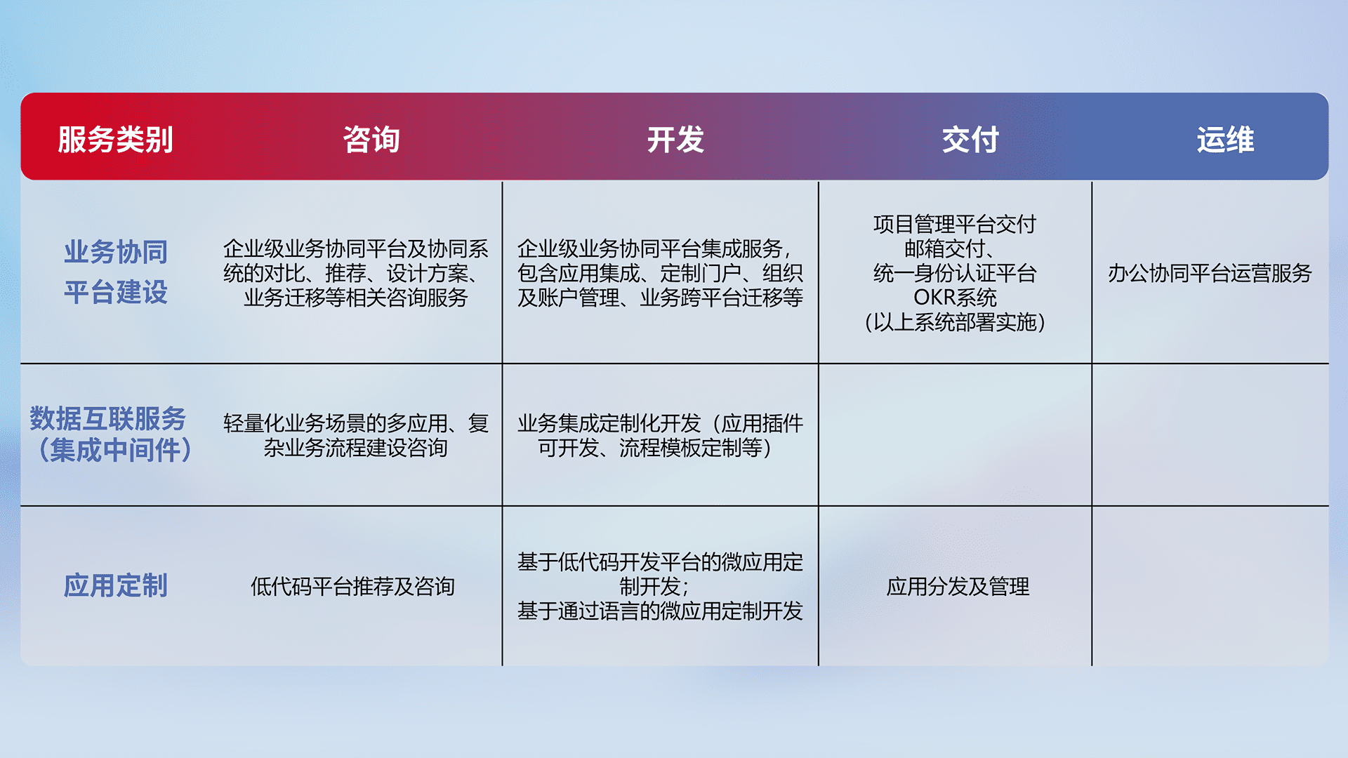 针对钉钉、、、企微、、、IDaas等平台级产品提供产品的规划、、、、方案、、交付、、、、定制化开发等服务,,实现如统一协同办公、、、、智能客户服务、、、混合会议管理、、智能数据查询、、、、等业务场景,,,实现数字化转型。。