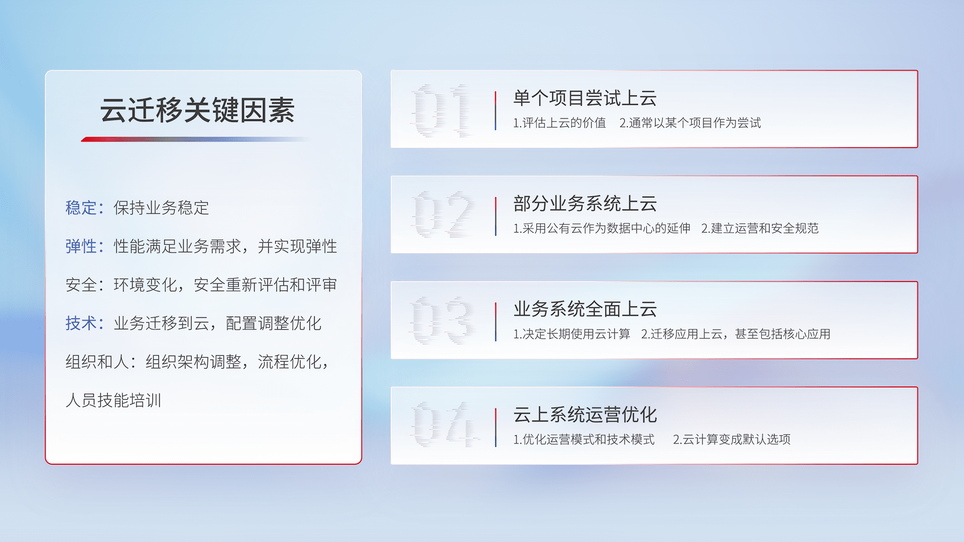 结合实际业务,,,从规划设计、、云平台选型、、、、云原生改造、、、数据迁移、、集成交付,,,迁移全过程为客户识别最佳上云路径,,做好风险识别管理,,设计网络架构、、、、身份权限、、、安全审计合规、、、操作审计、、日志审计、、监控告警策略、、、多站点容灾设计等,,,对云上基础设施进行整体规划,,提升IT治理水平,,以满足弹性、、、、高可用、、、、高性能的需求。。