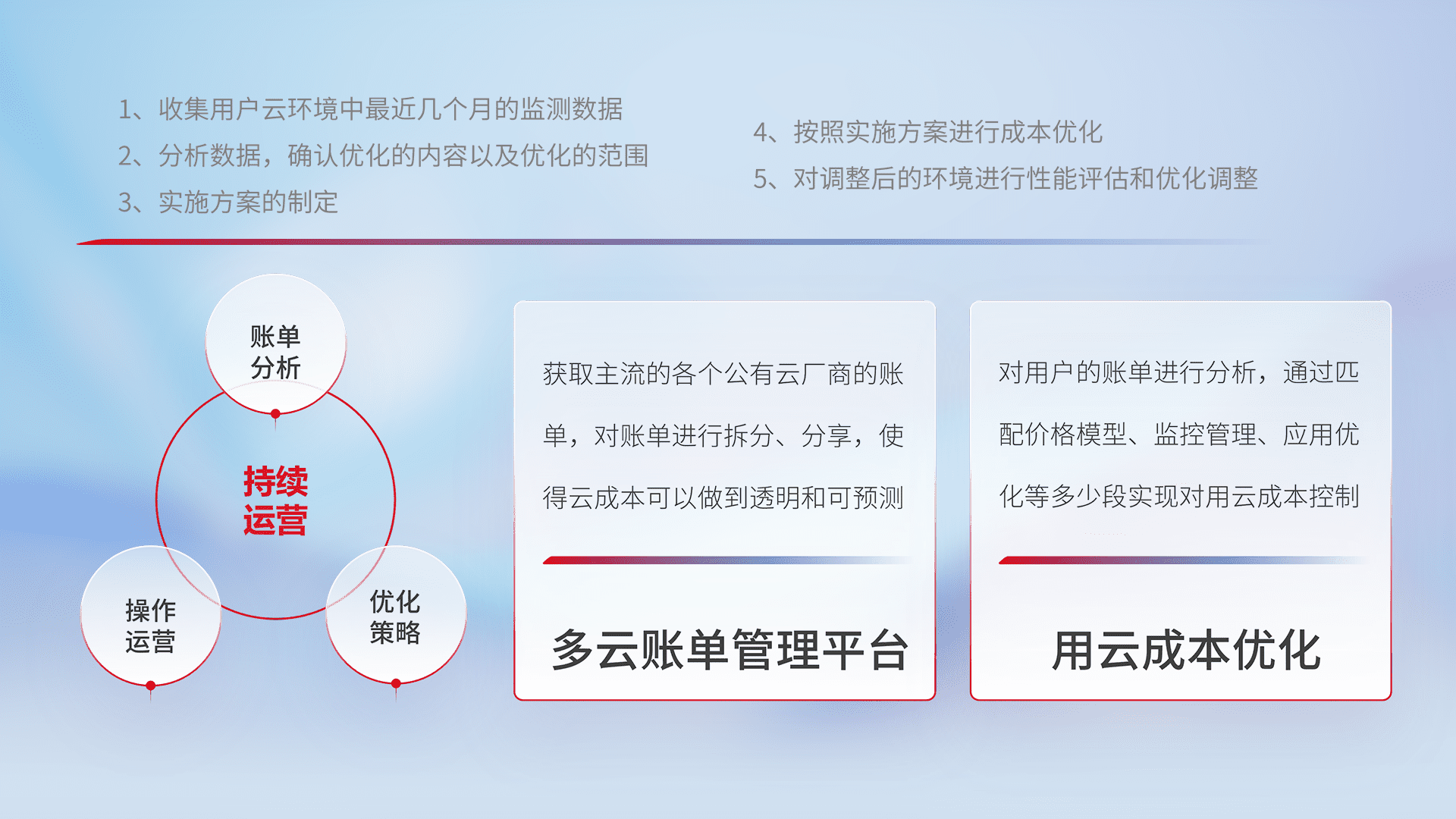 通过多云纳管,,,以统一的资源数据模型把客户的云资源进行抽象和封装,,进而实现对多云资源的统一操作,,,保障云资源管理的可靠性、、稳定性与可用性。。。量身定制化运维内容,,配置、、、开发运维、、补丁管理、、、备份、、监控、、认证和访问管理、、、审计和日常巡检等,,,,保障在用云过程中的可靠度,,稳定度以及高可用率。。。。